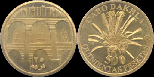 | двойной номинал - в песетах Западной Сахары и в динарах (сантиматах) Марокко |