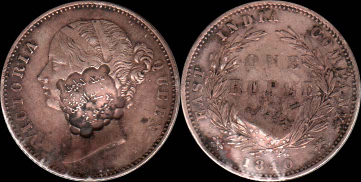 | надчеканка на India Rupee 1840, Британская Индия, KM # 458 |